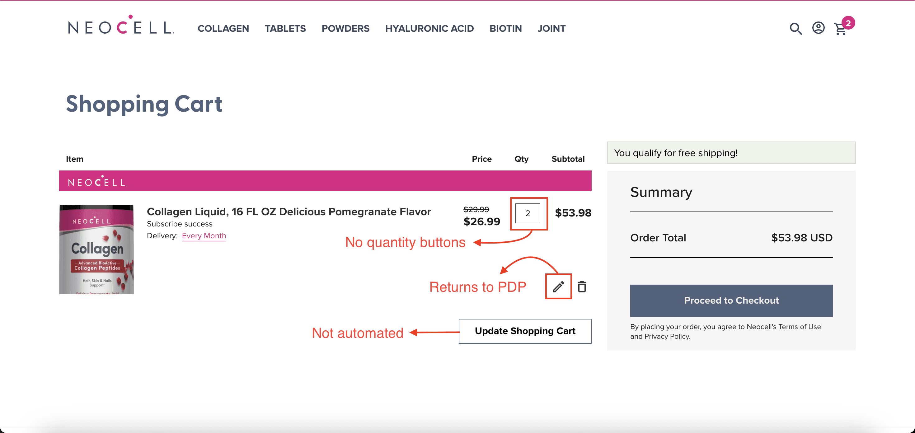 The cart page also retains redundant design elements- pink bars, non-automated update button and others.